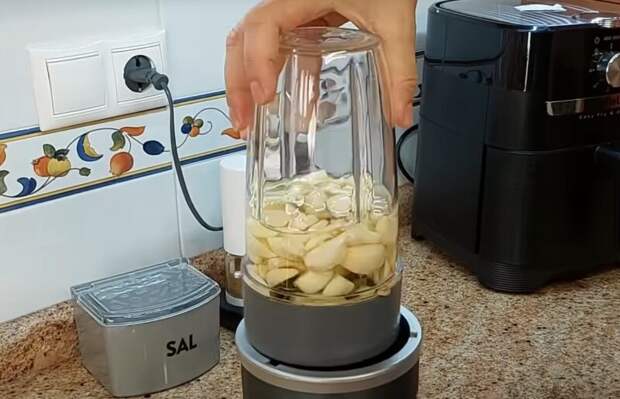 Выкладываем зубчики очищенного чеснока в чашу блендера, вливаем растительное масло. Важно, чтобы масло покрывало весь чеснок.