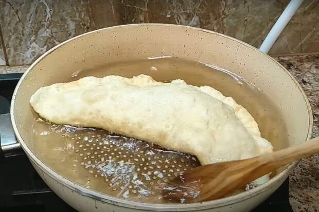 Аналогично работаем с остальными колобками теста. Разогреваем 300 мл растительного масла, выкладываем в него чебуреки и обжариваем, поливая верхушку раскаленным маслом.
